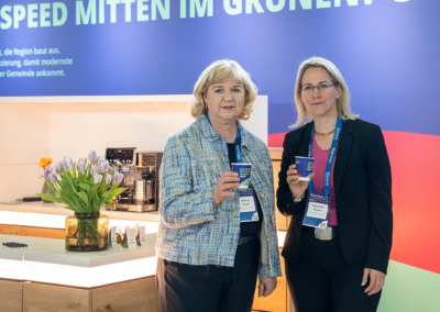 Großes Interesse fand der Vortrag „Gigabitförderung: Was ist zu erwarten?“ von Ellen Greifeneder, aconium GmbH, auf dem kommunalen Marktplatz. Der hoheitlich beliehene Projektträger informierte dort über aktuelle Entwicklungen im Förderprogramm und stand mit den Besucherinnen und Besuchern zu den Rahmenbedingungen der Gigabitförderung im Austausch.