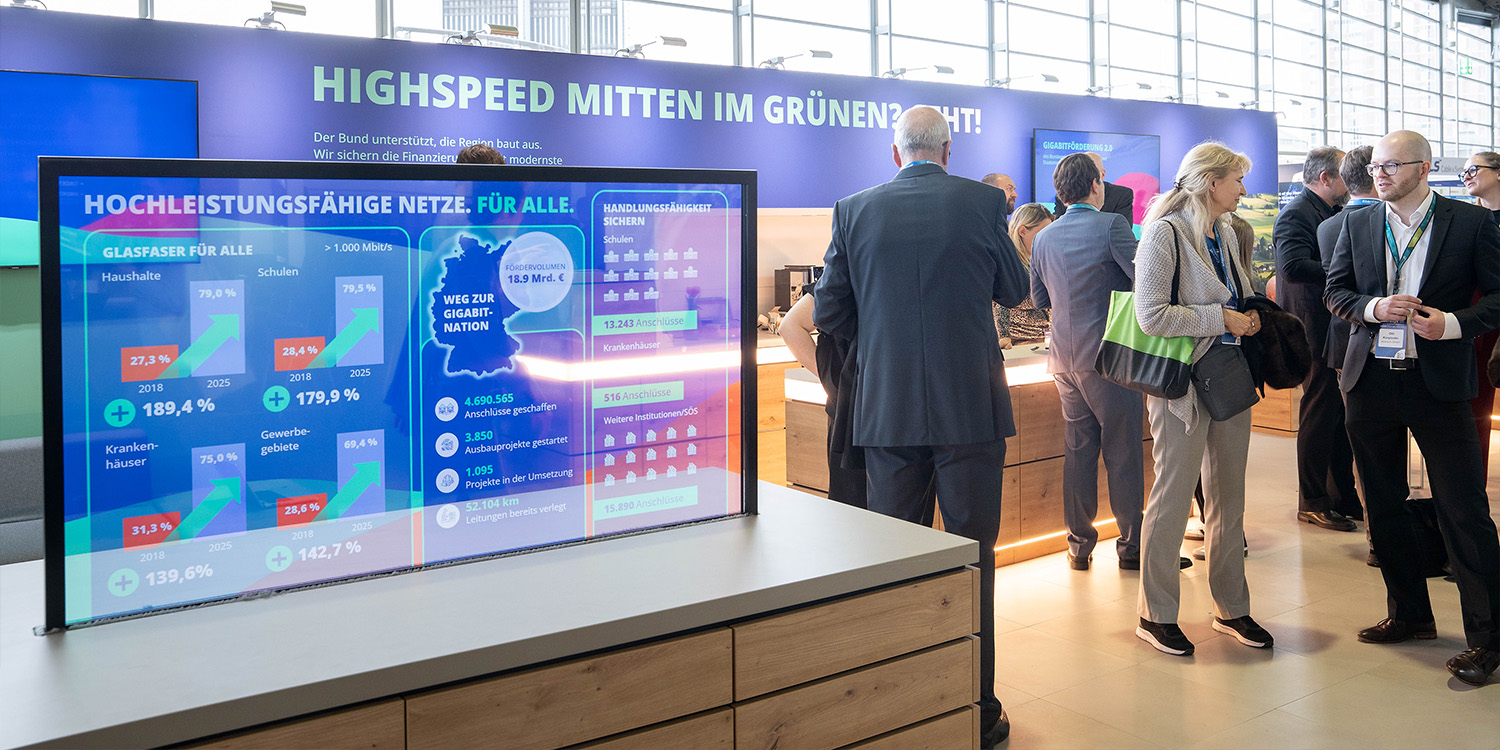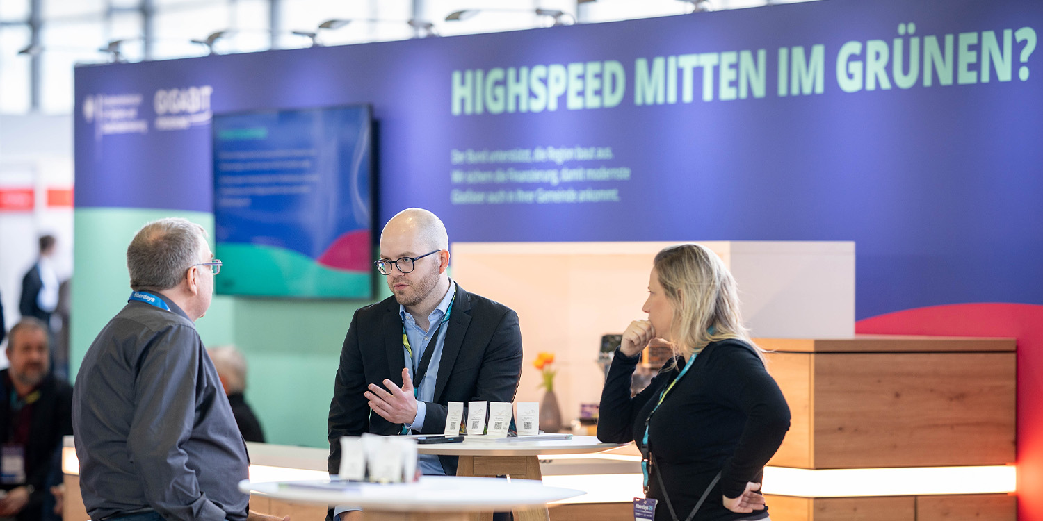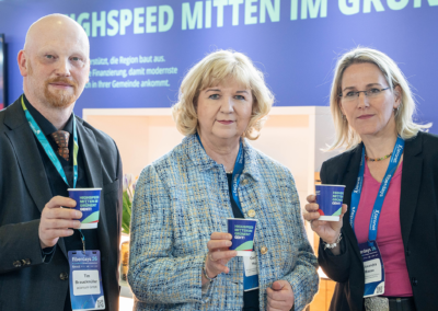 Im Fokus des Messeauftritts standen der Austausch zum Förderverfahren sowie zu den einzelnen Phasen der Gigabitförderung. Zahlreiche Kommunen und Zuwendungsempfänger nutzten die Gelegenheit, ihre Vorhaben mit den zuständigen Fördermittelberaterinnen und Fördermittelberatern zu erörtern. Zugleich bot die Messe einen geeigneten Rahmen für Gespräche mit weiteren Kommunen, Zuwendungsempfängern und Multiplikatoren aus der Branche.